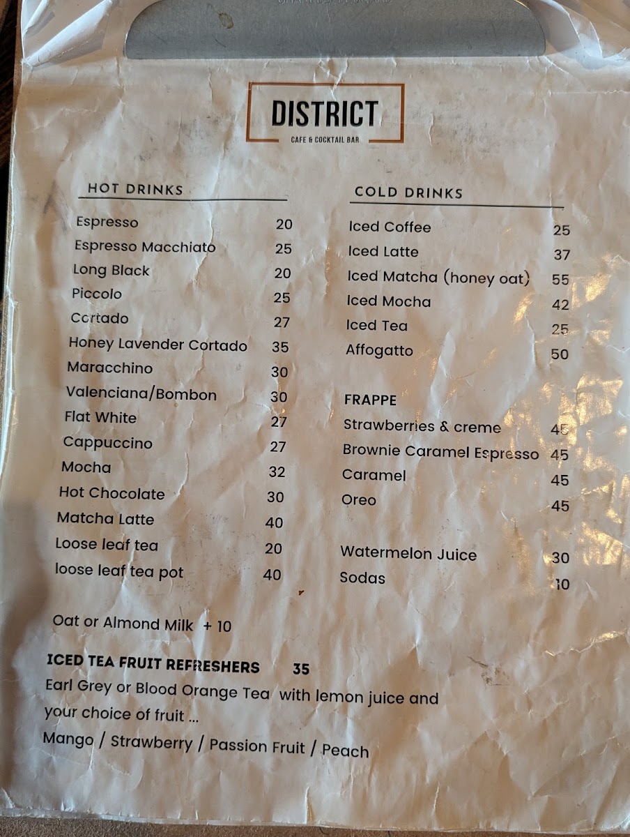 The menu at District Cafe & Cocktail Bar offers a range of beverages and food items suitable for various times of the day, including breakfast, coffee breaks, and light meals. Visitors will find a selection of coffee and specialty drinks such as Matcha Latte, Earl Grey & Mango Refresher, Mochaccino, and Cortadito.